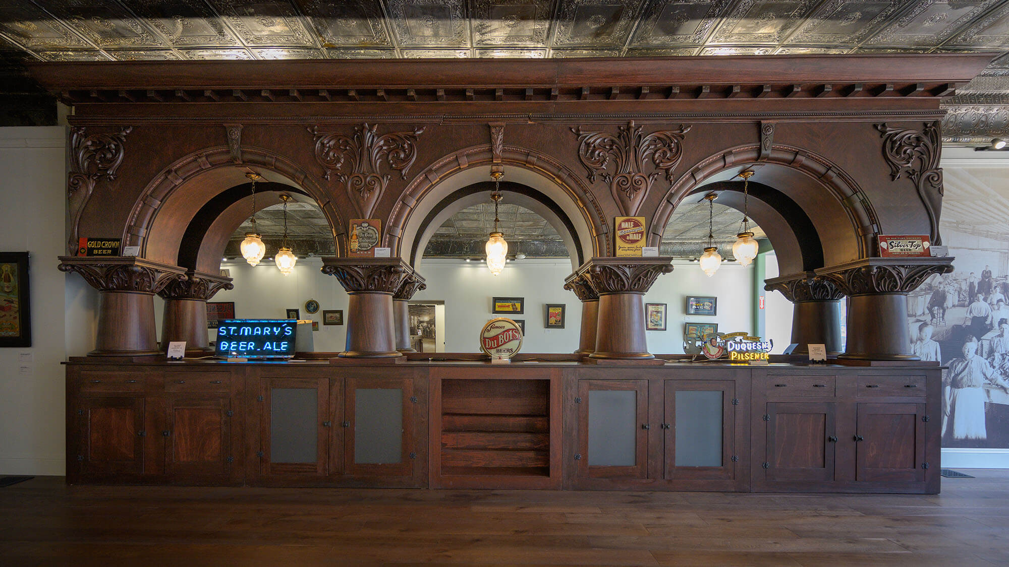 The Period Bar Exhibit (c. 1900) was built around a rare 20-foot mahogany bar with a cherry top and a triple-arched cherry back bar crafted by the Kloak Brothers of Cincinnati, Ohio. Period-authentic furnishings and antique gaming machines accompanied it, including two beautifully restored slot machines from the early 20th century.