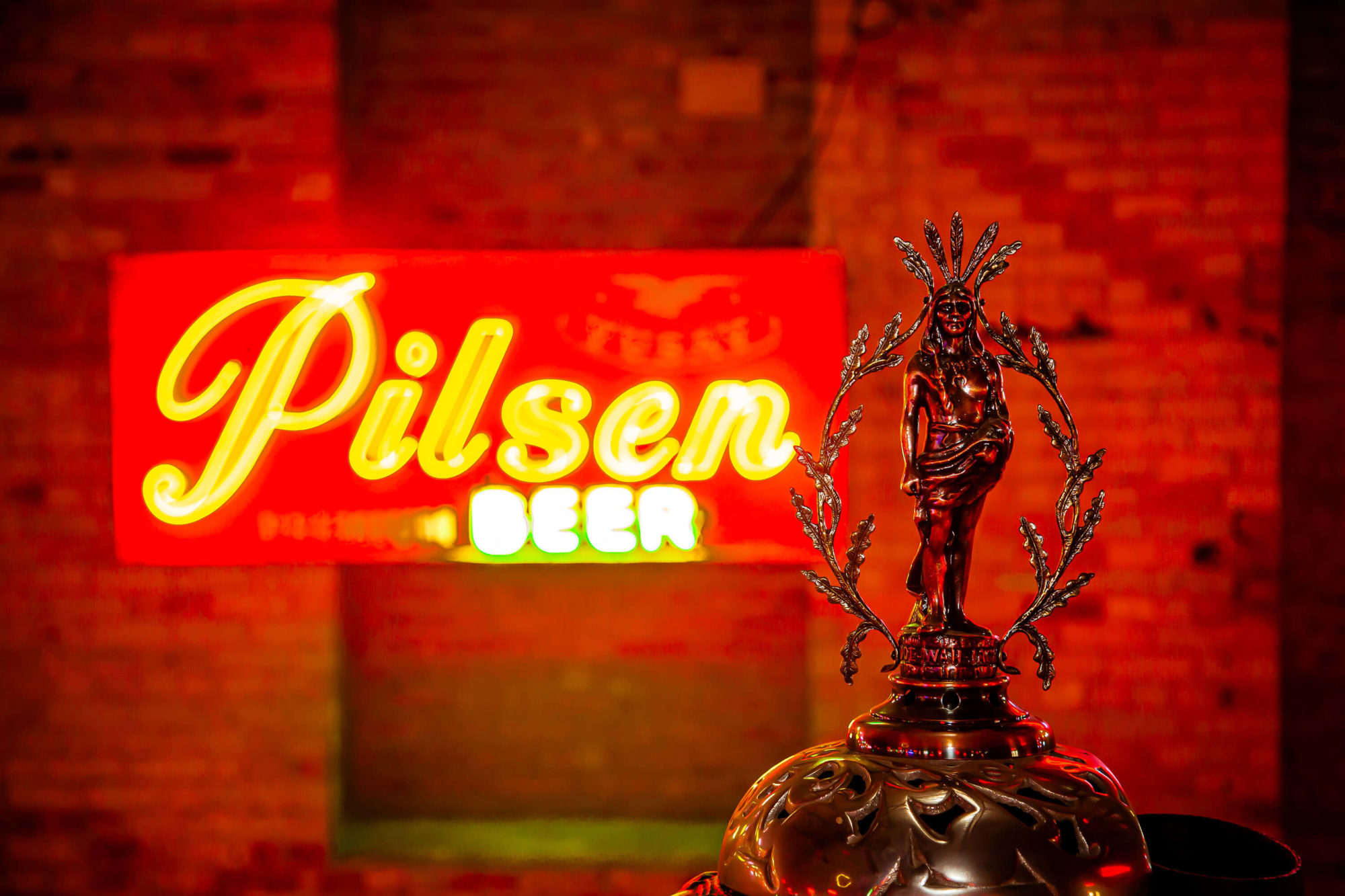 The hall featured an extensive collection of restored porcelain neon signs and smaller neon pieces spanning decades of American brewing history. Pulled from the Cone Top Museum’s private collection, many of these signs had once perched above sidewalks, tavern rooftops and corner stores—bright beacons of beer in their prime.